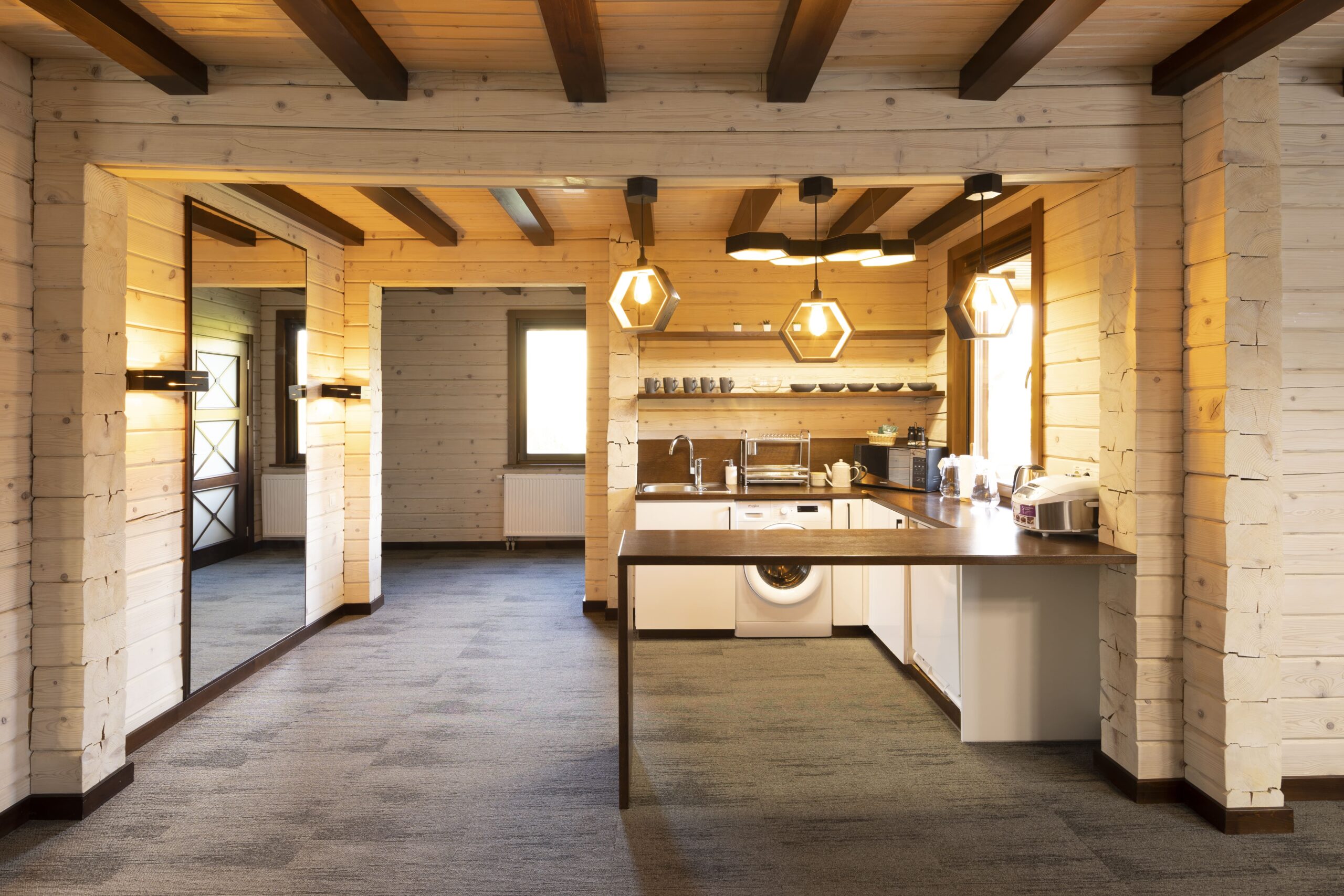 У котеджі є електрочайник, мультиварка, мікрохвильова піч, пральна машина, прасувальна дошка та праска.