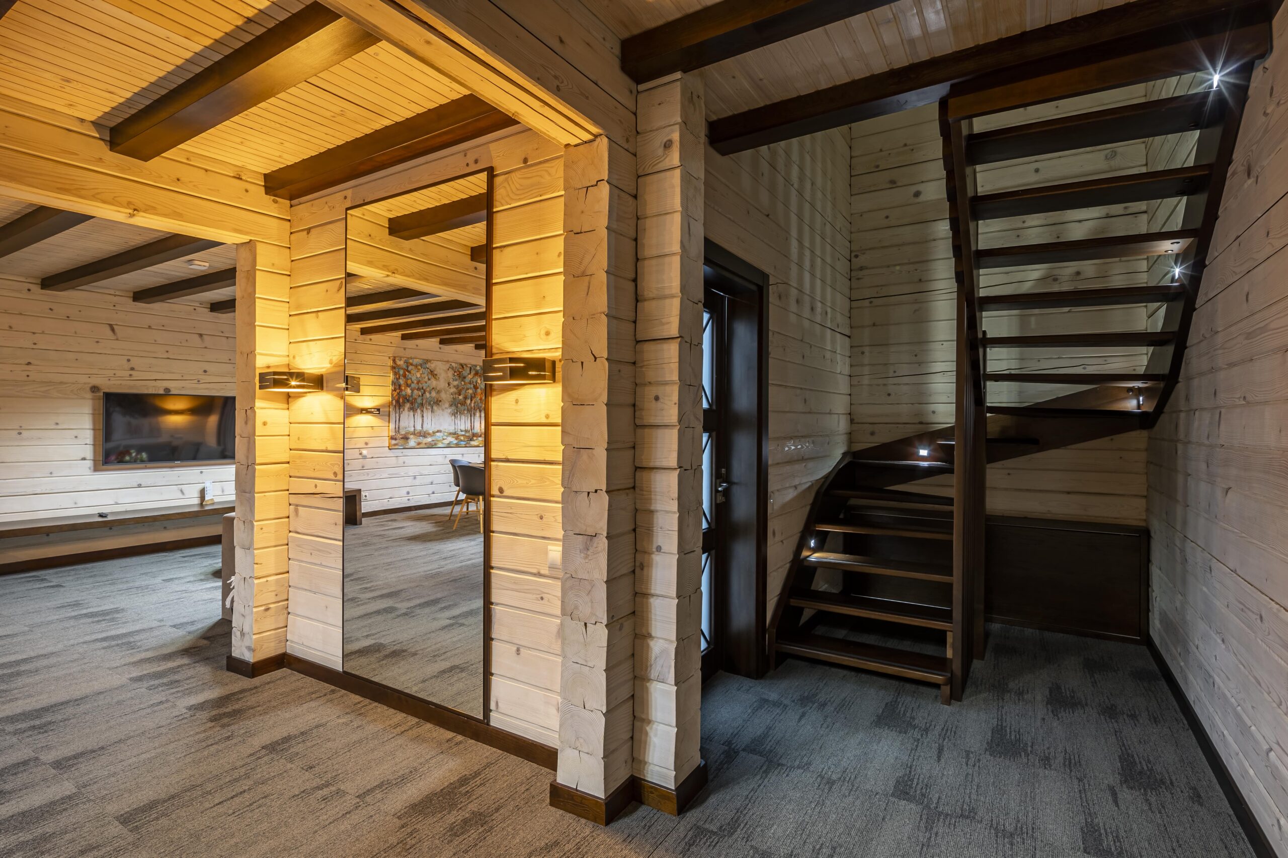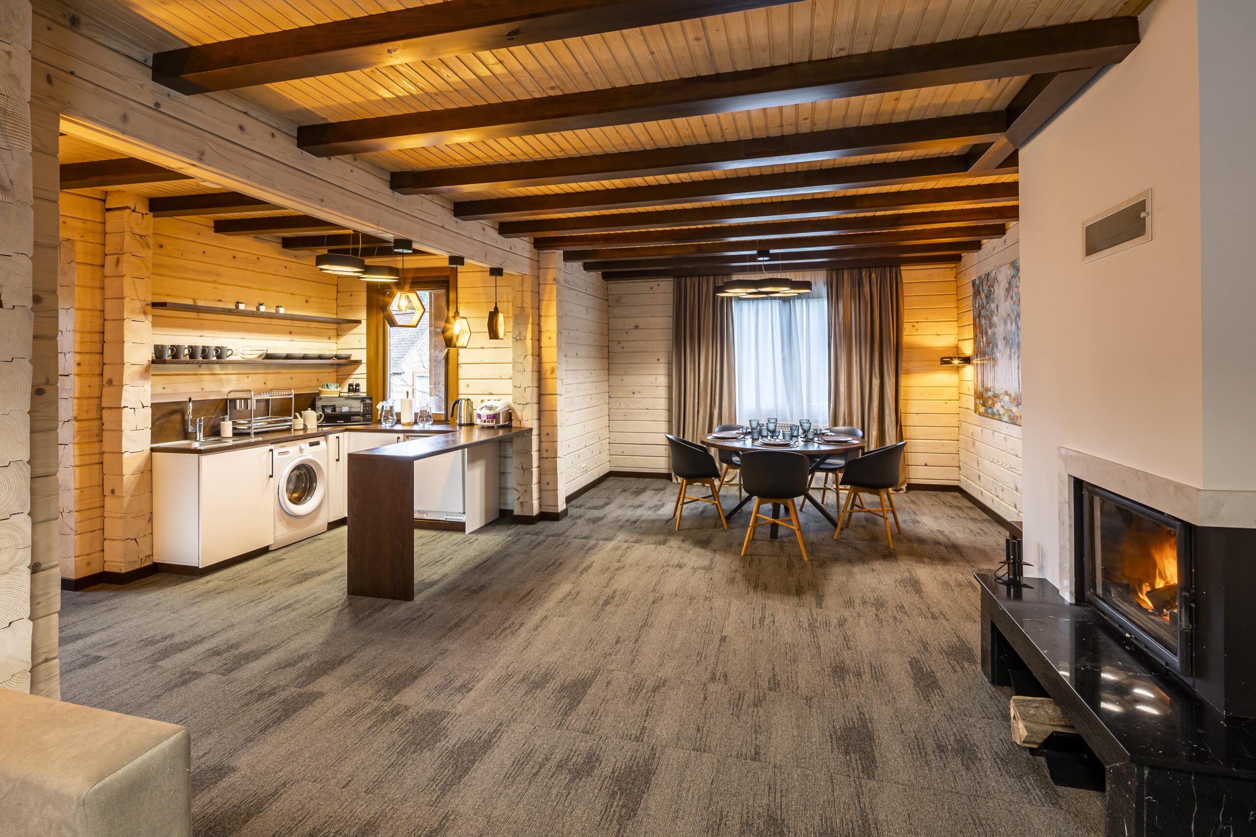 На першому поверсі розташована кухня-студія з великим обіднім столом та необхідним обладнанням для приготування улюблених страв. Поруч велика вітальня з каміном, телевізором та розкладним диваном, яка облаштована для Ваших затишних сімейних вечорів та відпочинку в дружньому колі. Також на першому поверсі знаходиться санвузл з душовою кабінкою, туалетом та умивальником.