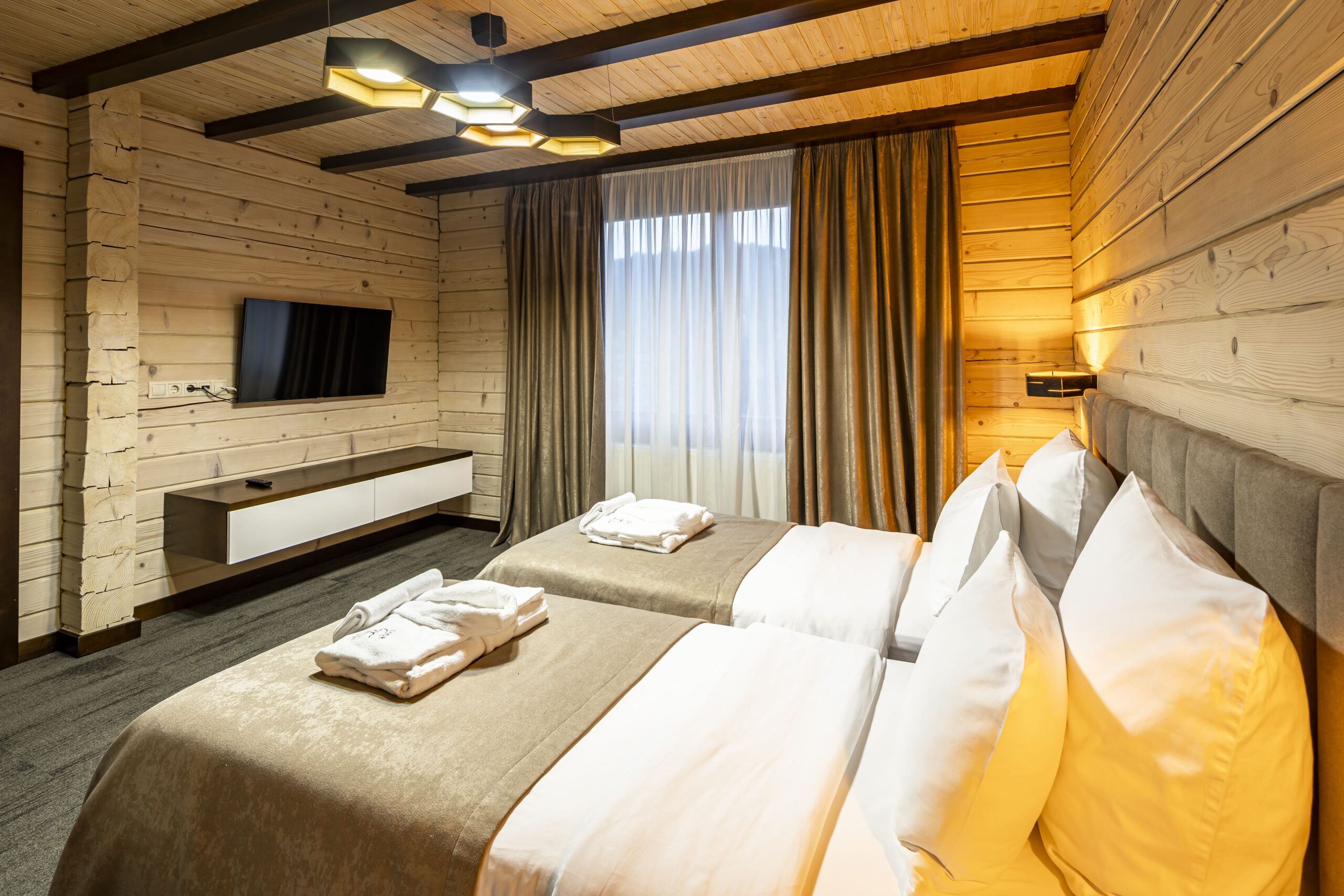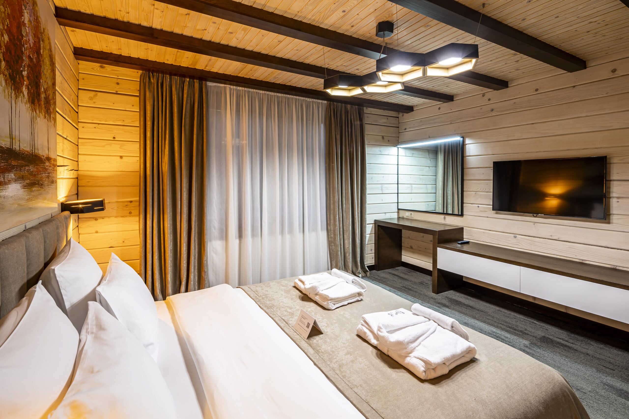 Cучасний двоповерховий Делюкс котедж, створений з екологічно чистих матеріалів, ідеально поєднує комфорт і природну гармонію. Просторий і затишний, він передбачає розміщення від 2 до 4 осіб на основних місцях, а також диван слугує додатковим місцем для ще 2 осіб.