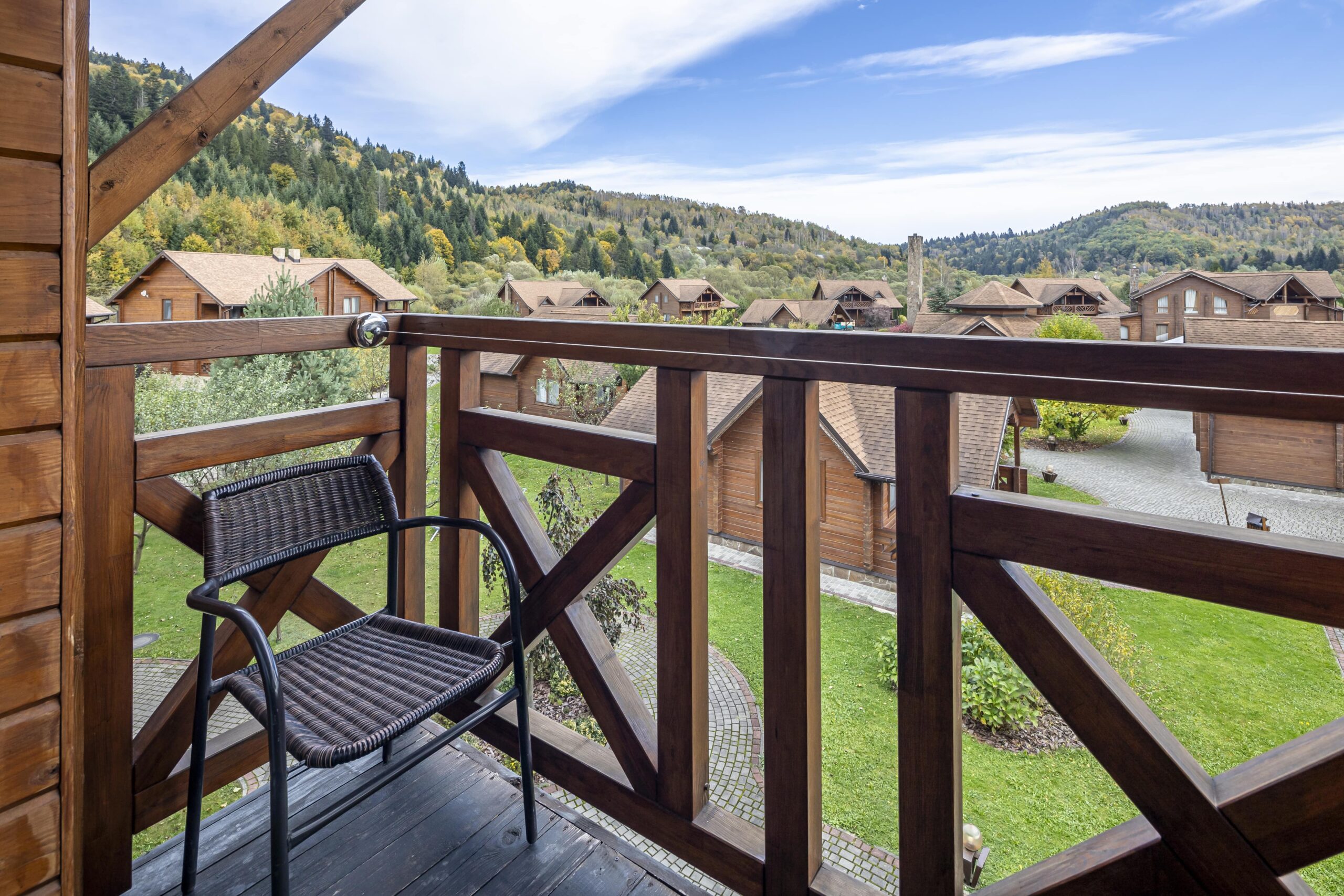 Особливої уваги заслуговує балкон з неймовірним видом на гірські вершини, природу та на весь відпочинковий комплекс. Це ідеальне місце для ранкової кави та релаксу.