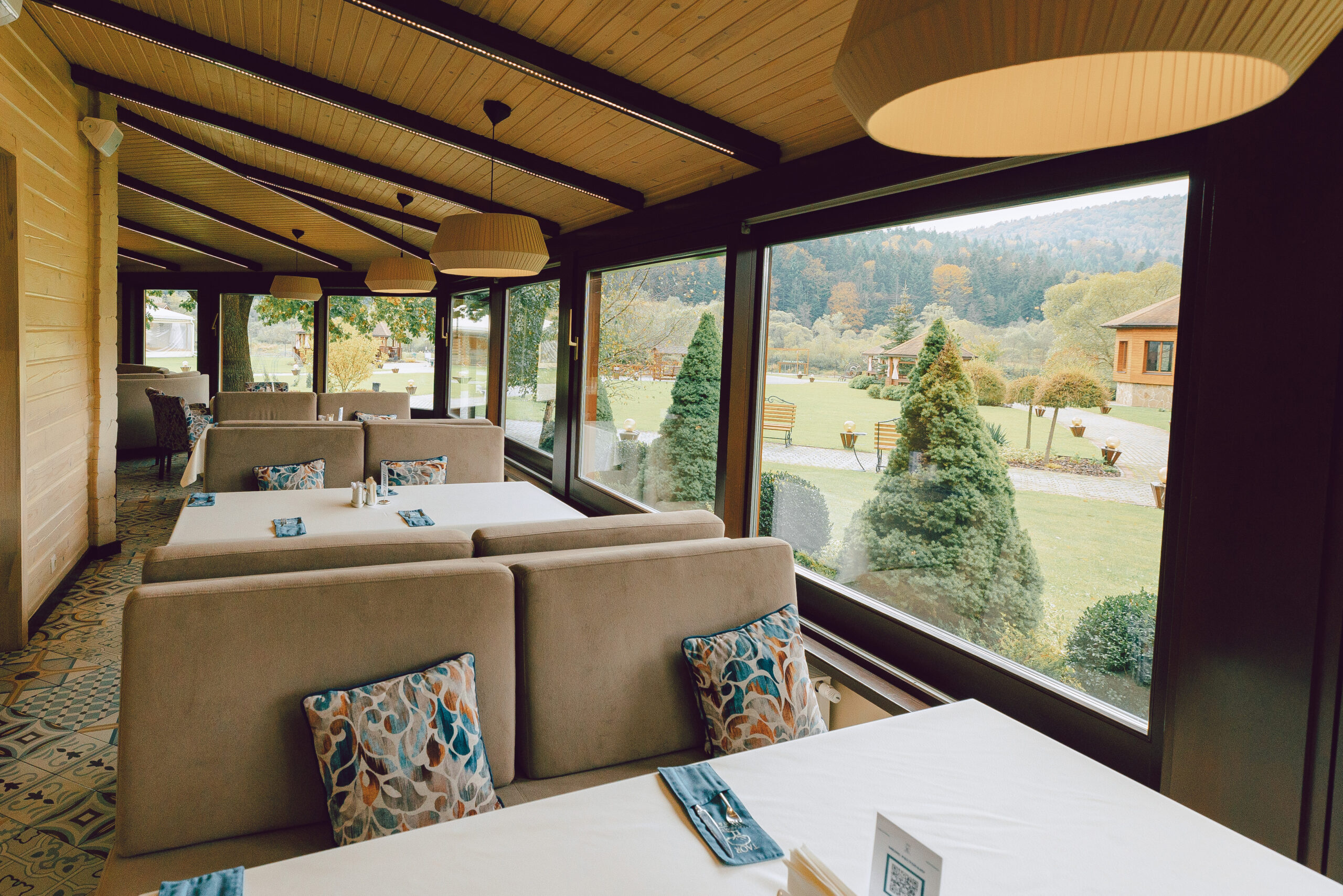 Гости TAOR Karpaty Resort & Spa часто любят завтракать на террасе ресторана, откуда открывается сказочный пейзаж на горы и реку Стрий.